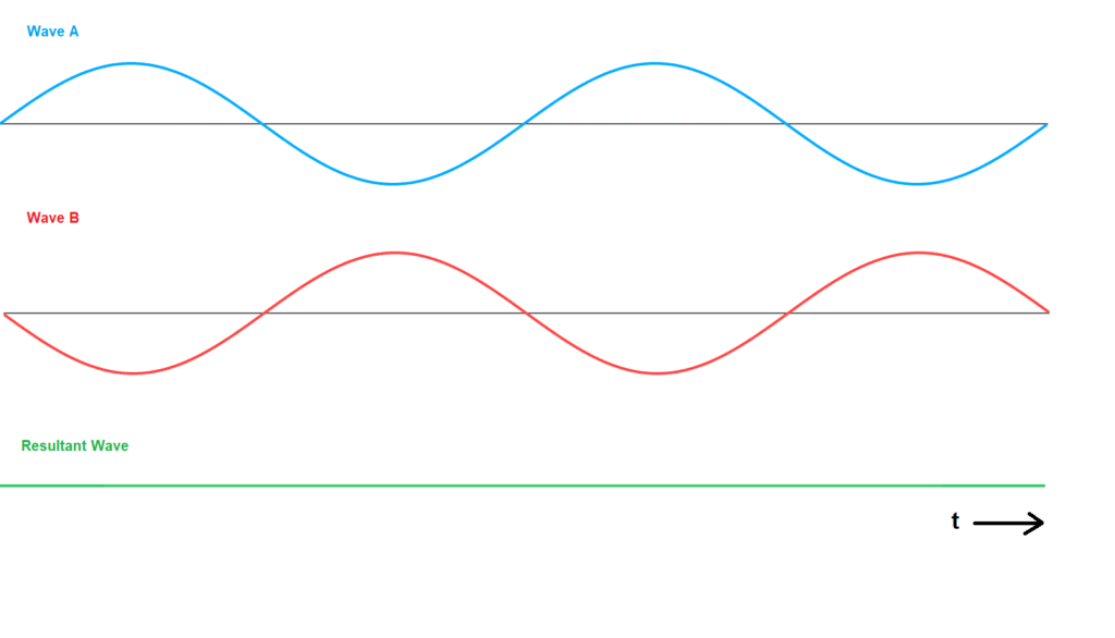 When the noise wave and the generated wave meet, they cancel each other out as a result of destructive interference.
